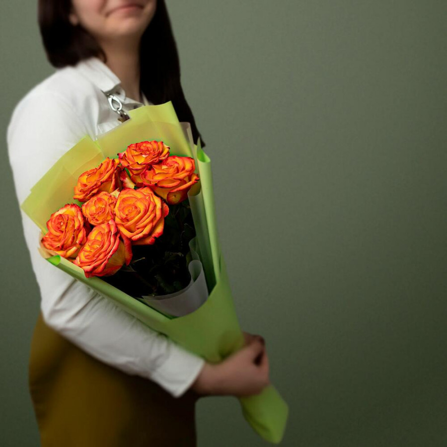 На фото букет из 7 оранжевых роз. В составе: роза 7 шт, дизайнерская упаковка 2 шт, атласная лента 1 шт, . Все цветы свежие и ароматные, букет красиво оформлен и отлично подходит для подарка. Доступна доставка цветов или самовывоз.