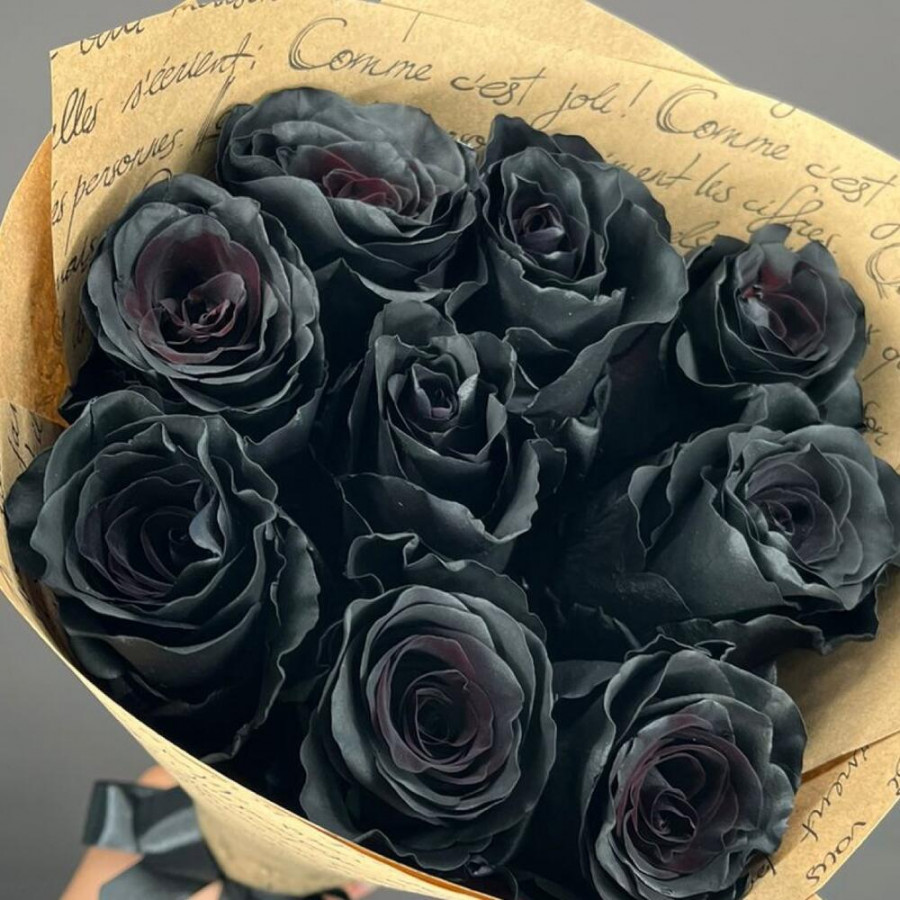 На фото букет из 9 черных роз. В составе: роза 9 шт, дизайнерская упаковка 1 шт, атласная лента 1 шт, . Все цветы свежие и ароматные, букет красиво оформлен и отлично подходит для подарка. Доступна доставка цветов или самовывоз.