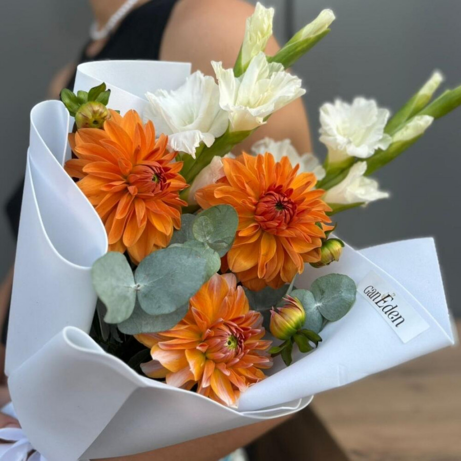 На фото букет с георгинами и гладиолусами. В составе: георгина 3 шт, гладиолус 2 шт, эвкалипт 2 шт, дизайнерская упаковка 1 шт, атласная лента 1 шт, . Все цветы свежие и ароматные, букет красиво оформлен и отлично подходит для подарка. Доступна доставка цветов или самовывоз.